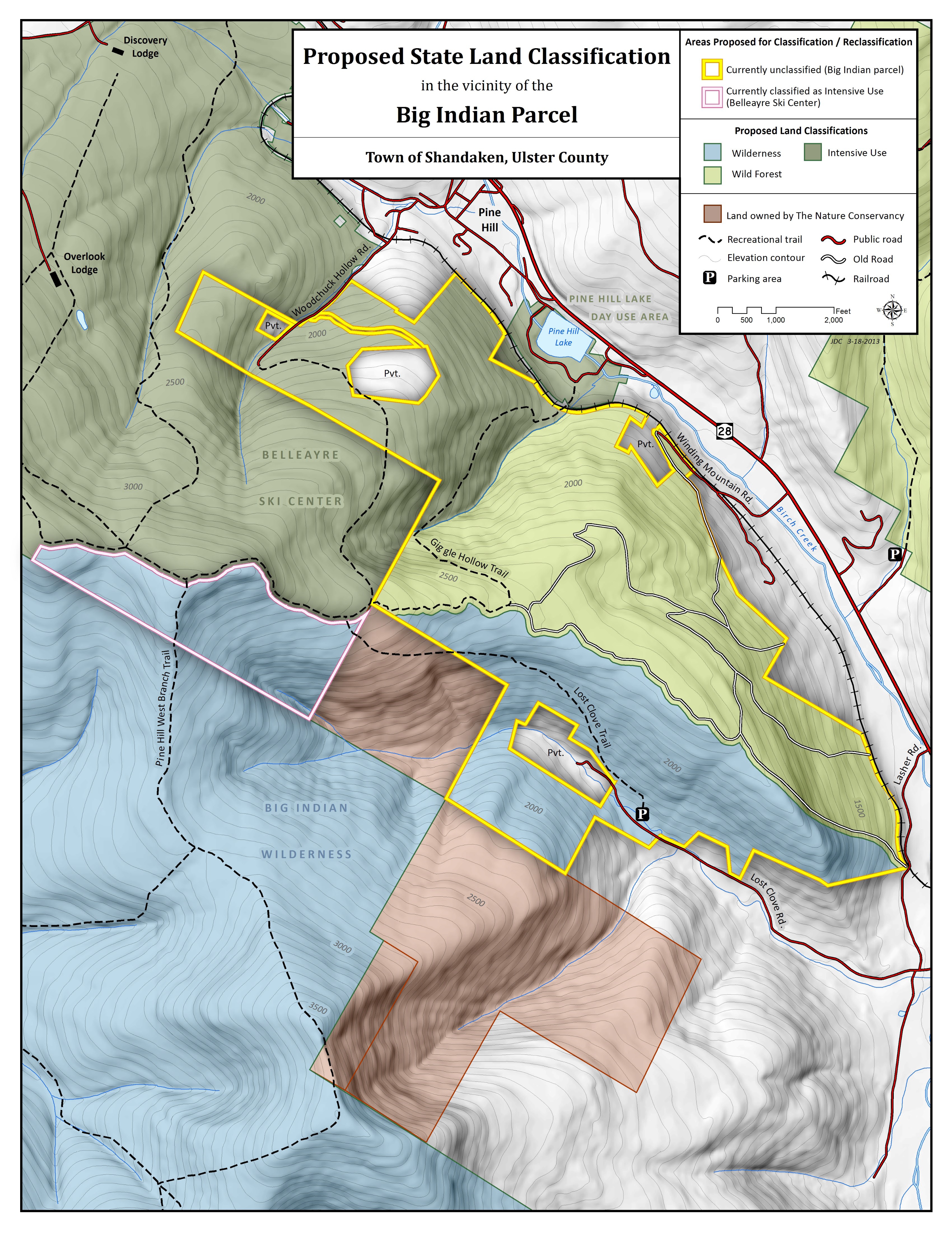 A draft of the Catskill Park State Land Master Plan Land Classification Amendment was first published by the state in June. Of the 1,204 acres, 263 acres west of Giggle Hollow Brook will be added to the ski area, 542 acres north of the eastern ridge of Belleayre Mountain and east of Giggle Hollow Brook will become part of the Shandaken Wild Forest, and 361 acres in the Lost Clove area will be dedicated to expand the Big Indian Wilderness Area.