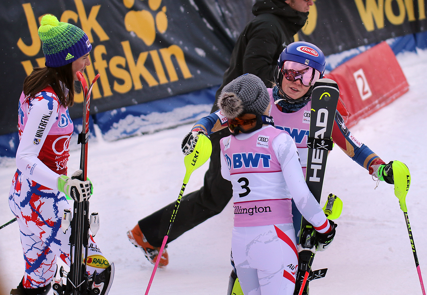 After her first place finish U.S.A.’s Mikaela Shiffrin hugs third place winner Austrian Bernadette Schild (3) at the women’s Audi FIS Ski World Cup slalom race at Killington in Vermont on Sunday, November 26, 2017. At left is Slovakian skier Petra Vlhova who came in second. (FTO photo: Martin Griff)
