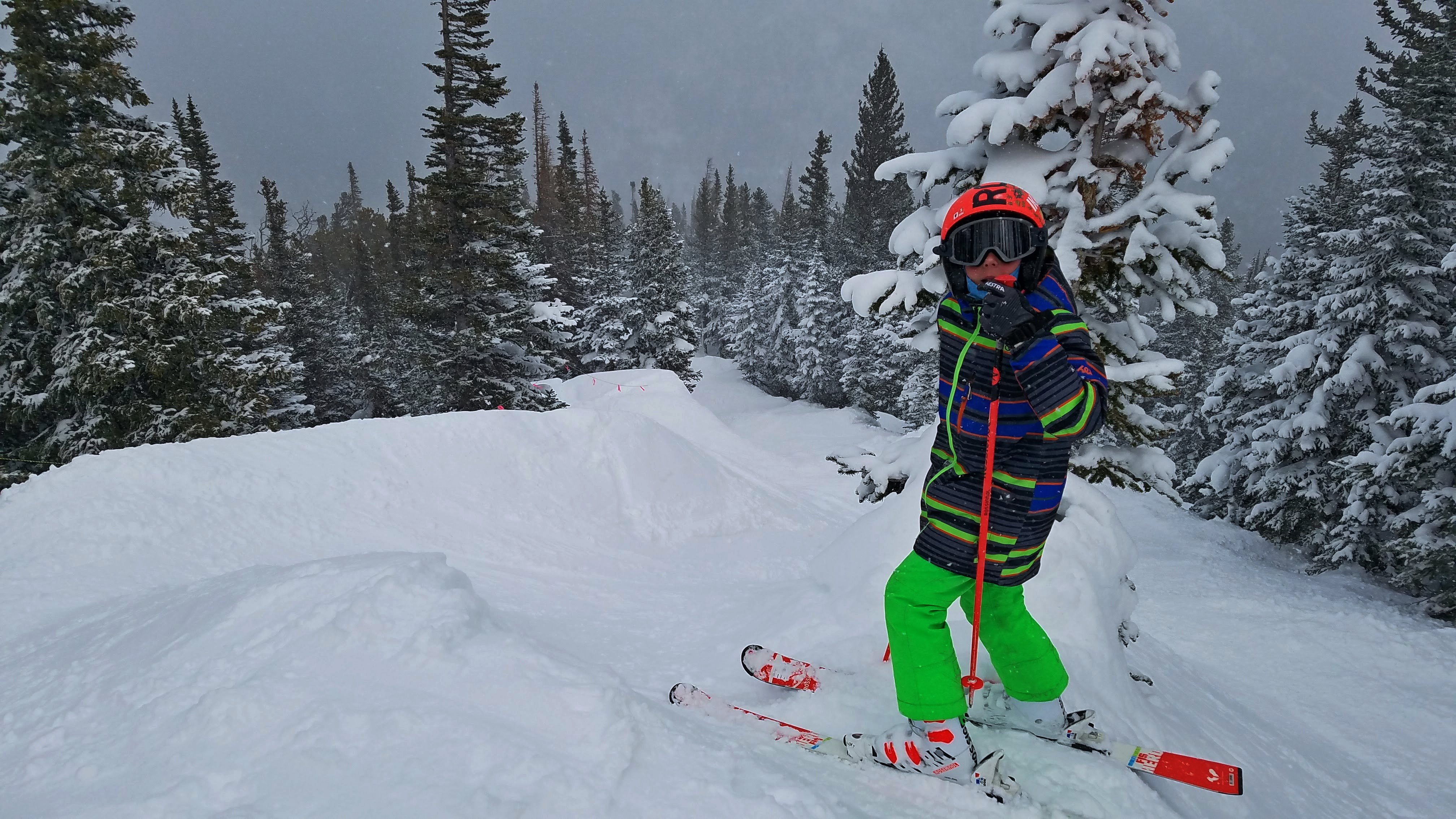 Jr did a full set of steeps runs with me today: Upper Ambush, Moose, Salto, West Ridge, Gully Glade, Pillows (not on trail map). Super fun to see him doing well on those. Though he did mange to fall and lose a ski for a minute or two in the Pillows. We skied all the way to closing bell today.