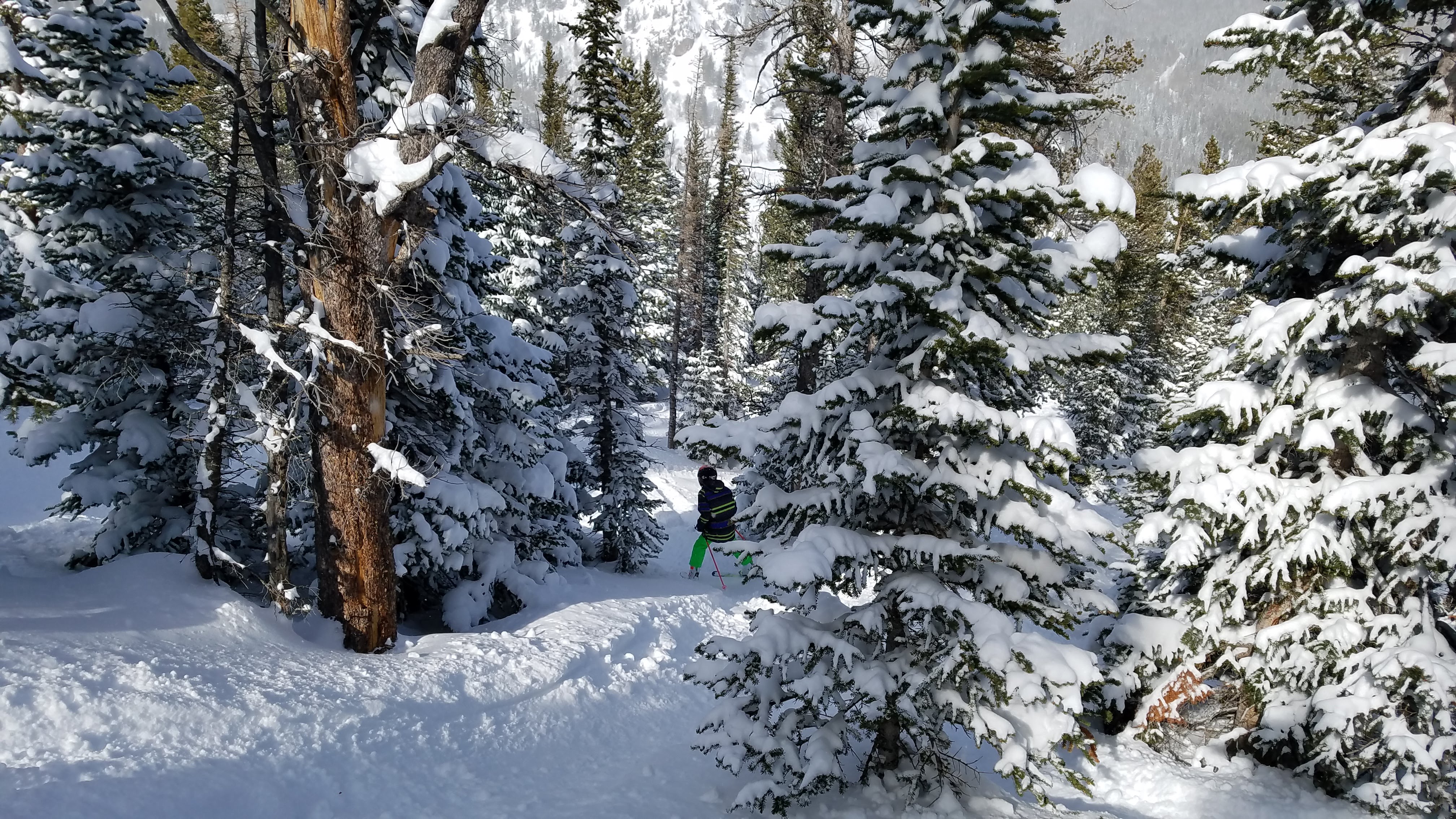 Jr had race training on Sunday but was able to ski a couple of runs on the steeps with me after. Today we had to do a late start, but the skiing was so nice and some decent leftovers if you knew where to look. With sunshine and just a couple flurries with clouds still over the divide. Supposedly a couple more inches tonight and possibly again wed night. Eldora skiing doesn't get much better than it is right now. Surfaces are excellent, hardly any rocks or logs to find anymore, etc... Even things like lower Moose glade, which is rarely open, are open and with great snow (of course only a tiny handful of folks even know where I'm talking about).