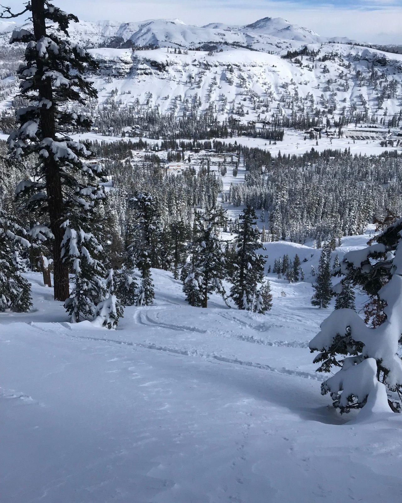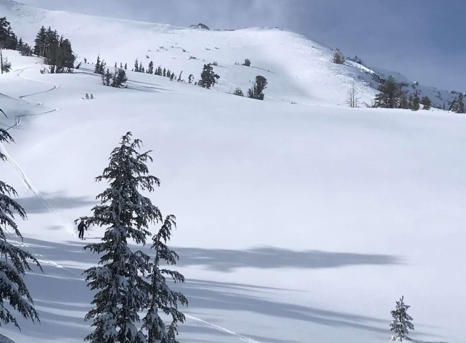 I next took two Cornice/Timber Creek laps into the Palisades, taking highest traverse which required some stepping up. The top was wind affected, but lower down was lightly tracked and very skiable. Pictures are looking down Palisades, then back up at what I skied.