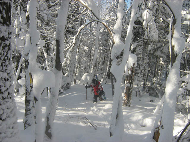 What difference a week makes as while the weather in Montreal was rain and wet snow with no accumulation , dry powder was falling in the Laurentian snow belt . So this morning I convinced my son to come on a hike and make some turns with the promise that I would take him over to a chairlift in the afternoon after hiking /skiing in the morning . Conditions were mid winter as there was probably 2 to 3 feet that fell over the last few days. Busy day :)