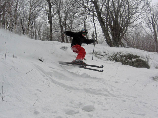 Start of the HS , Primary school break in Quebec and didn't want the younger generation sitting at home playing call of duty all day so used up a vacation day to take them out on a Friday . A few inches of snow fell on Thursday ( March 1 ) setting up decent natural snow conditions this morning for first tracks . Freezing rain started around noon and continued all afternoon . It didn't affect the snow as it was light , however kept icing up the goggles . Could be a wild day tomorrow weather wise as snow , rain and ice in the forecast , will see what happens.