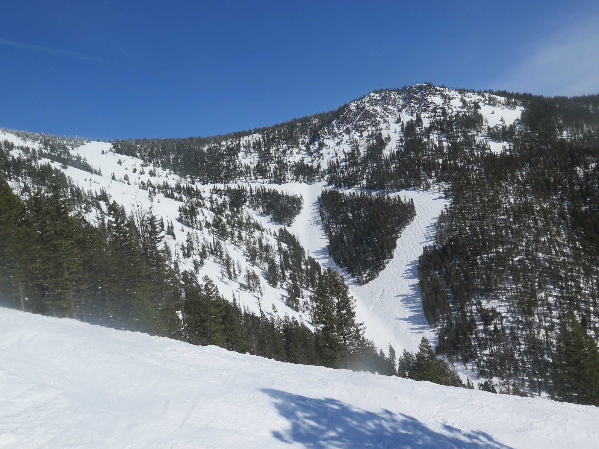 Our original plan for this week targeted Lost Trail for Thursday as it is closed Monday-Wednesday. However the last meaningful snow in the region was last Friday and this week was forecast sunny from Wednesday onwards. So I changed plan and opted for Montana Snowbowl on that first sunny day, hoping for good spring snow in its 2,600 vertical front side bowl. The weather forecast was accurate, resulting in SE faces softening by noon and other frontside by 2PM.