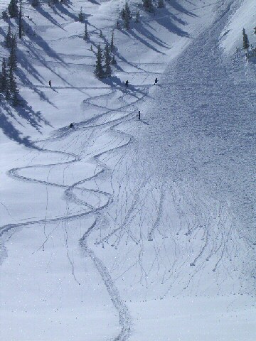 Sooooo.......I ate lunch and headed up to Solitude for the afternoon. Got there around noon-thirty and had a blast in deep deep deep powder. If a trail was ungroomed and of blue square pitch, you really couldn't make it through the <somewhat denser than typical since it's spring> powder unless you straight-lined it or took _big_ swooping turns that didn't deviate that much from the fall line. But face shots abounded and it was insanely deep in the tree shots like Headwall Forest and the Black Forest in Honeycomb Canyon. Yeah, the lake effect bands absolutely hammered us. We went over the magic 200" base mark Wednesday night. I've totally lost track of snowfall - something like 11 feet over the past 2 weeks.*