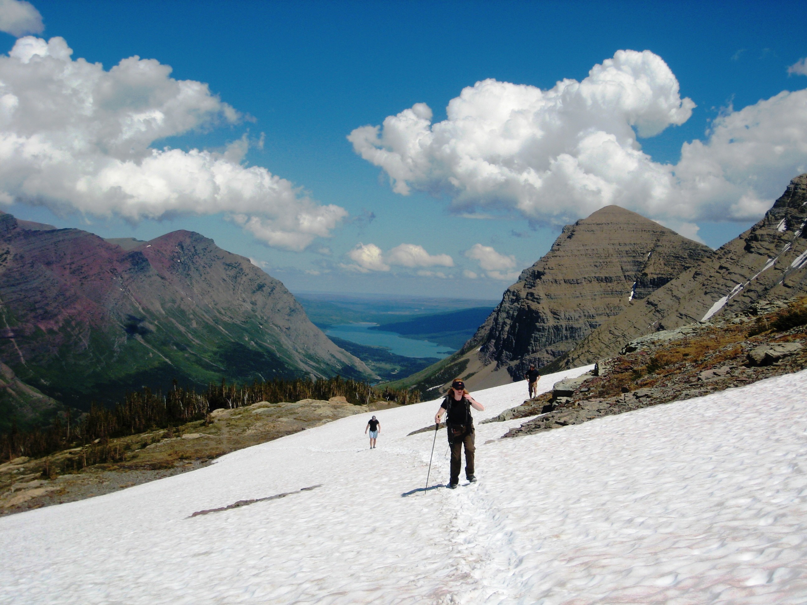 The couple behind Liz is the only one that passed us all day. We met 3 other people on the way down and 5 on the other side of the pass, who had come from Granite Park Chalet on its first open day of the season. This area is likely busier later in the season when Highline trail is open and the Chalet is full with overnight backpackers.